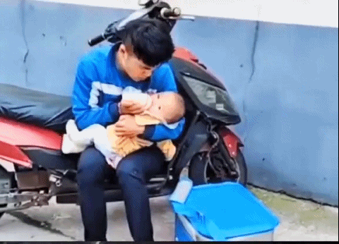 上一秒心头还是阴霾,下一刻眼前便是灿烂。 即使大雨颠覆了这座城市,也会有人给你温暖。 02 订单太多,工作太忙,没时间照顾孩子的外卖小哥,只好背着宝宝一起跑单。