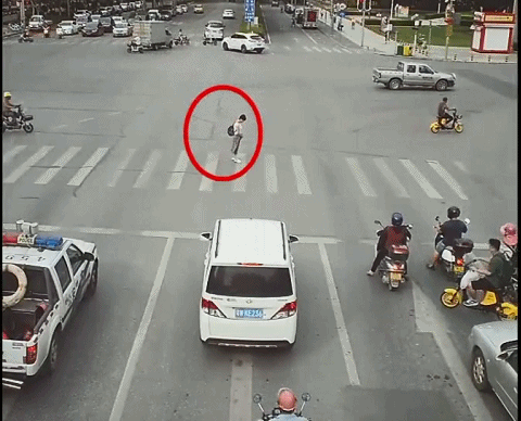原本糟糕的时刻,因为陌生人的援手,变得有所不同。 一整天,这对母子心里,应该都是暖的吧。 08 斑马线上,一位行动不便的残疾人,用自己最快的速度前行着。 但对面的绿灯,早就过了。 本来等待的车辆,还是启动了准备通过。
