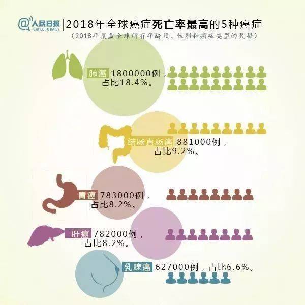 全球新发癌症发病率最高的依次为:肺癌(11.6%)、乳腺癌(11.6%)、结肠直肠癌(10.2%)、前列腺癌(7.1%)、胃癌(5.7%); 全球死亡率最高的癌症依次为:肺癌(18.4%)、结肠直肠癌(9.2%)、胃癌(8.2%)、肝癌(8.2%)、乳腺癌(6.6%)。 肺癌是“男性头号杀手”,乳腺癌是“女性头号杀手”