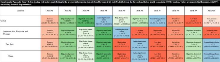 研究结果表明,到2040年,全世界195个国家和地区中,105个国家和地区的致死病因最高的是缺血性心脏病,其余国家和地区的致死风险因素高的疾病是中风和糖尿病。而无论是心血管疾病还是糖尿病,其发展趋势和发病的诱因,都和人们日常的饮食结构密切相关。 此外值得注意的是,由于全球老龄化的趋势,在39个国家和地区中,阿尔茨海默症成为排名第三的致死因素,而影响公众健康和寿命的最大威胁中,第一是烟草,第二是高血压。 在我国,高血糖、高胆固醇、高体重指数、高钠、酒精、大气颗粒物、室内污染、低水果摄入量,是影响健康和寿命的主要因素。可以清楚的发现,排名靠前的危险因素,都和吃有着密切关系。