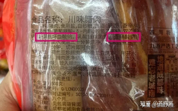 另外亚硝酸钠除了防腐,也可以作为发色剂使用,就是让红肉制品保持红色,更有卖相。