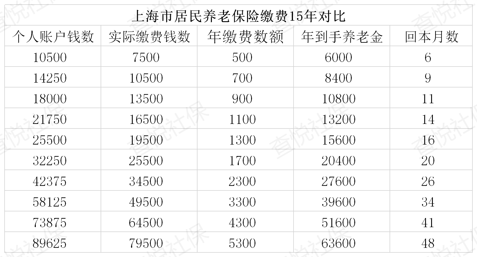 3、居民养老保险回本更快 相对于职工社保的复杂的计算公式,城乡居民养老保险的计算方法非常简单,能有多少咱自己就能算出来。记住了:(个人账户÷139)+退休的基础养老金≈到手养老金。 我们还拿经济状况较好的上海来举例,在不考虑养老金上涨的情况下,从下图中可以看到,按照最低缴费只需要6个月就回本了,居民养老保险是所有社保里性价比最高,回本最快的!