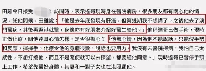 前两天他的好友曾向媒体透露,吴孟达早间查出身患肝癌,虽已完成手术,进入化疗阶段;