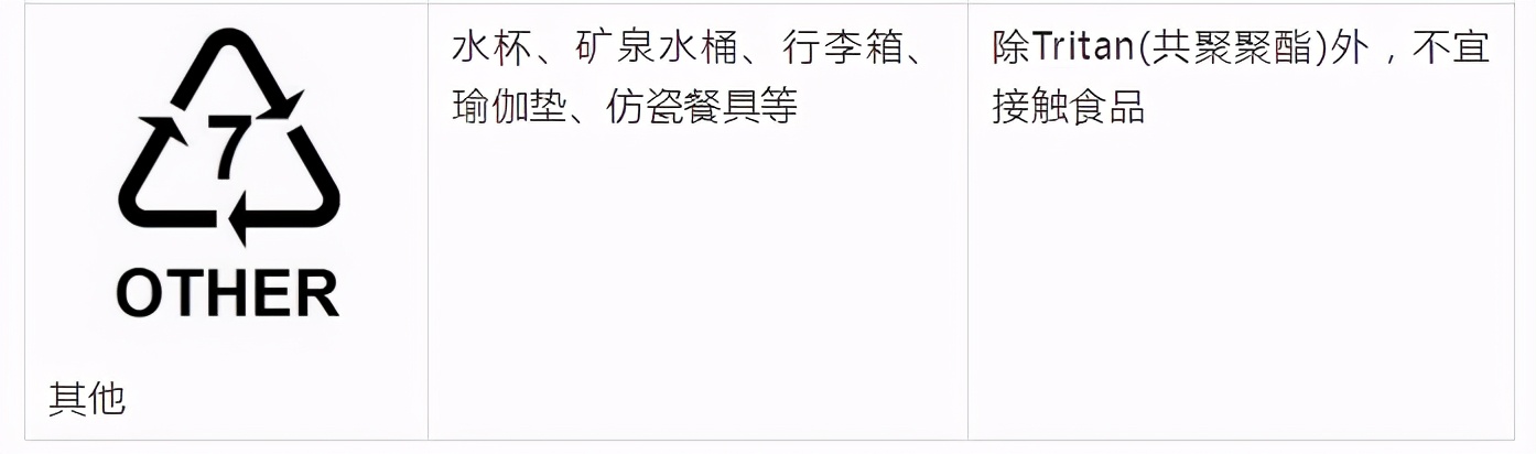 目前常用的塑料有七类,分别存在于下列物品中。
