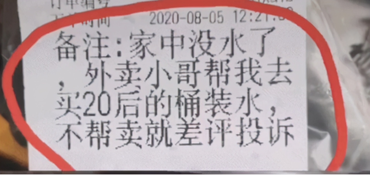 一个客户,点了一个简单的外卖,却要求外卖员带一桶20升的水到高楼上去,不然就给差评。