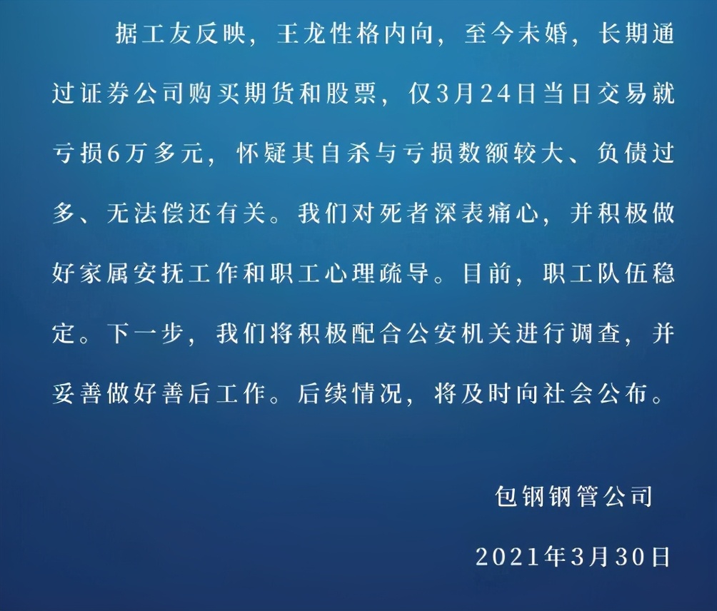 王龙今年34岁,未婚,性格也比较内向,长期购买期货和股票,就在他自杀当天,亏损了6万多。