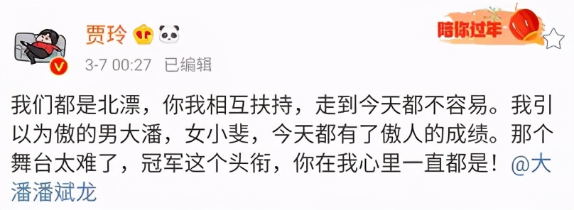 3月6日,喜剧人潘斌龙夺得《我就是演员》的冠军时,贾玲在微博写下一段触动人心的话:
