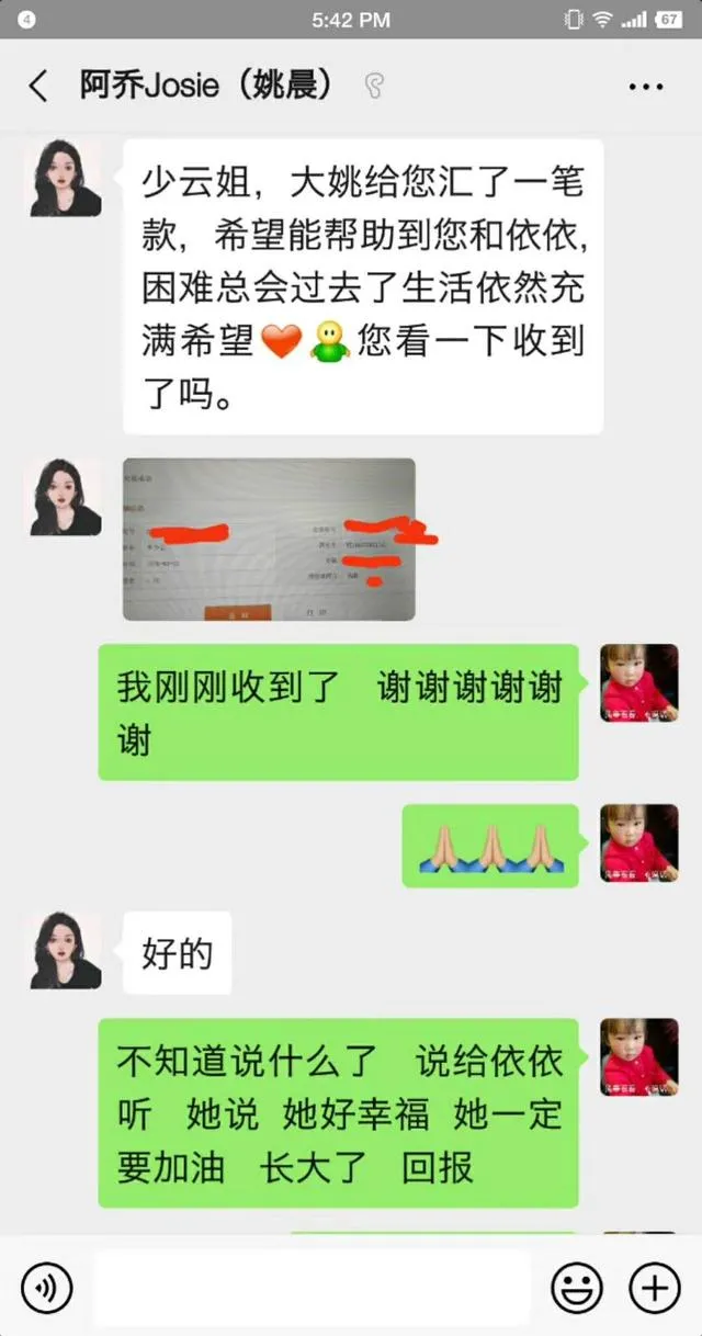 最让人意外的是,演员姚晨听了她的故事,给她汇款10万元。