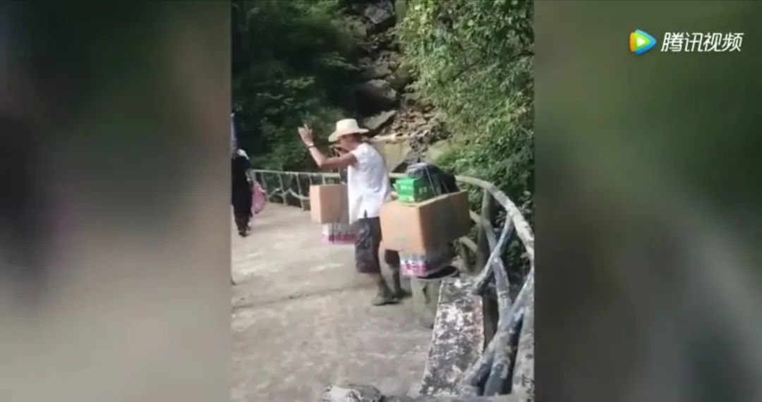 一位挑着担子的大爷,在山路觉得累了,就停下来,跟着音乐律动了起来;