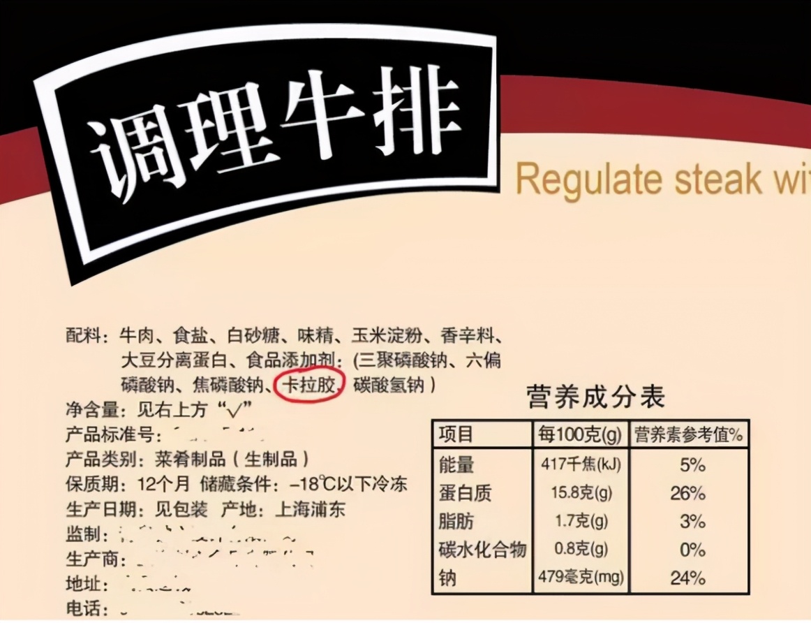 因此,如果配料表中会出现卡拉胶、黄原胶等,就一定要注意啦。而真正原切牛排的品名直称牛排,配料表里只有牛肉,不会有卡拉胶、黄原胶等。