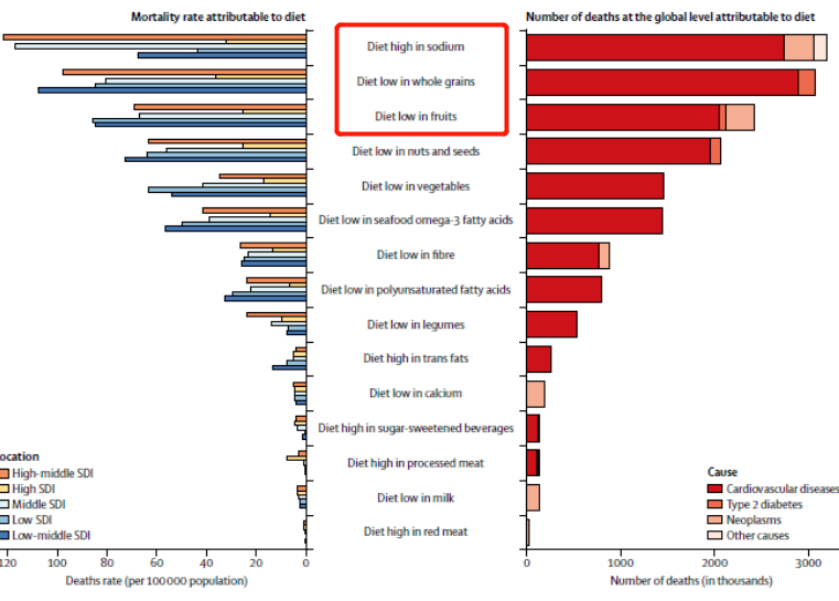 2019年,世界权威医学期刊《柳叶刀》曾经发布了全球饮食领域的大规模重磅研究。它覆盖全球195个国家、时间跨度近30年,分析了世界各国因为饮食结构导致的死亡率和疾病发生率。