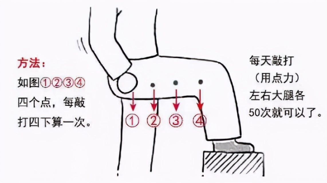 方法:胆经在下肢的循行路线是沿股、下肢外侧中线下行至小趾、次趾之间,就是沿着裤子中间的那条线至膝盖侧面处,非常好找。用拳头去捶大腿两侧,从大腿外侧根部开始一直敲到膝盖,敲50组(敲完一整条线为1组)。