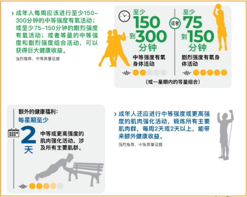 此外,所有成年人,包括有慢性病或残疾的人,每周至少进行150~300分钟的中等强度或者进行75~150分钟的高强度有氧活动。外加每周至少有2天进行中等或更高强度的肌肉训练。