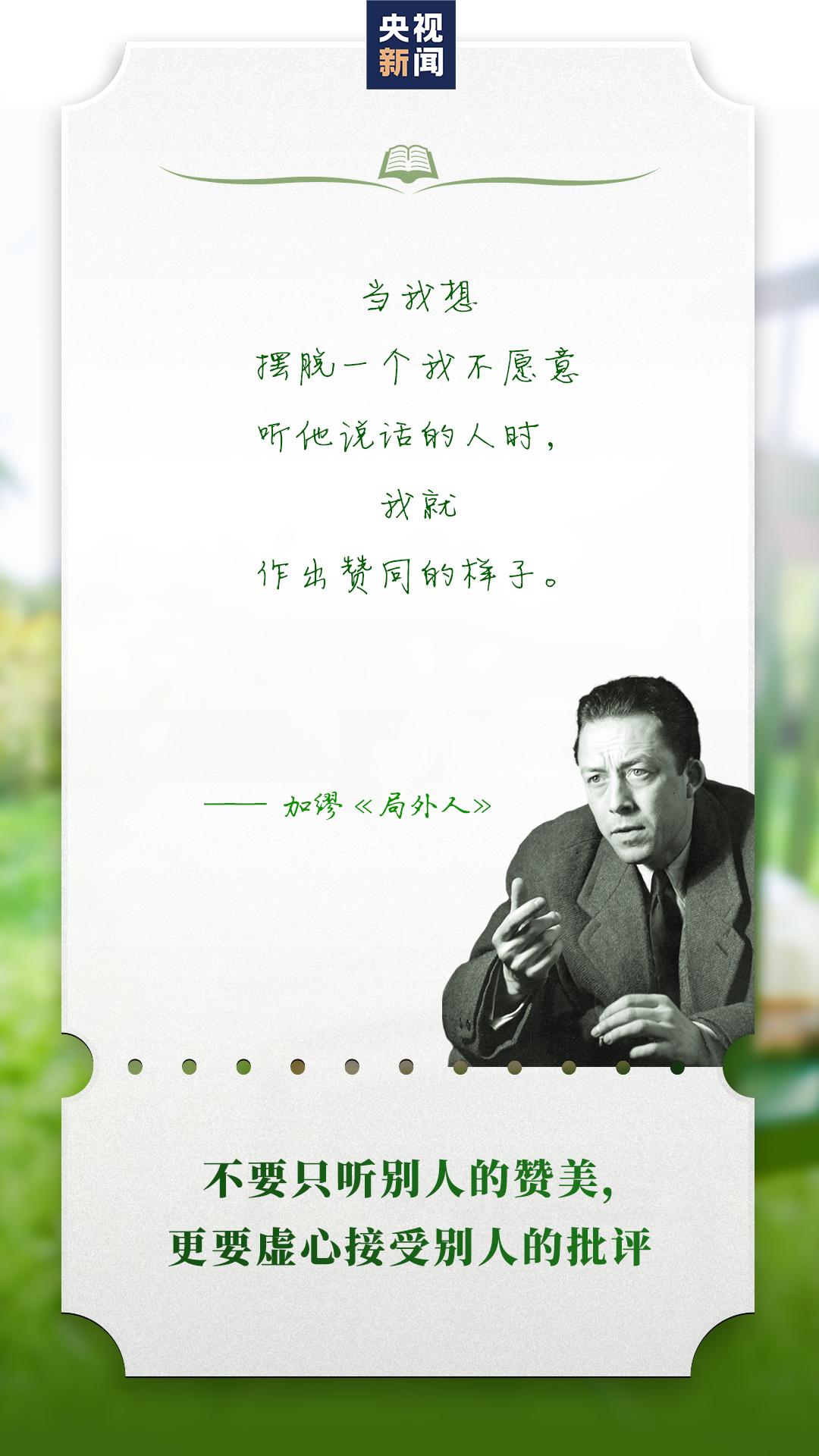 我们很少信任比我们好的人,宁肯避免与他们来往。相反,我们常对与我们相似、和我们有着共同弱点的人吐露心迹。我们并不希望改掉弱点,只希望受到怜悯与鼓励。 ——加缪《局外人》
