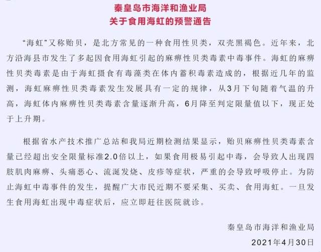 近日,河北秦皇岛市海洋和渔业局发布了关于食用海虹的预警通告。通告显示,根据近期检测结果,海虹体内所含麻痹性贝类毒素已经超出安全限量标准两倍以上,如果食用极易引起中毒。