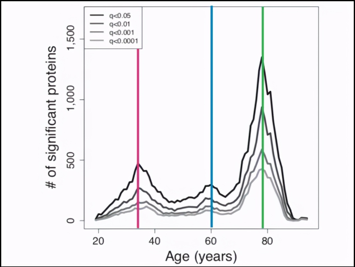 而这其中,衰老相关蛋白的数目并不是随年龄的增加平稳地改变,而是呈波动变化,并在34岁、60岁和78岁年龄段出现极峰。而在其他时期,这些蛋白质的水平在一段时间内保持相对的恒定。