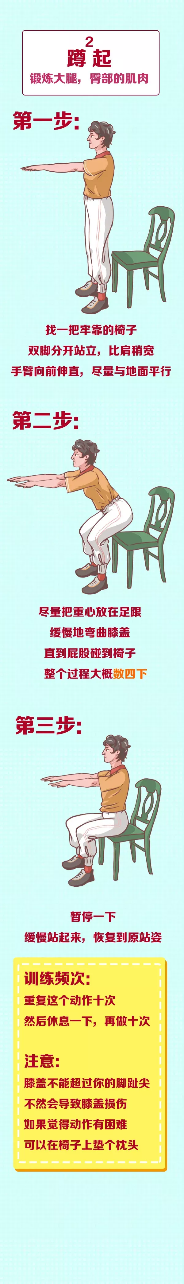 下面是美国疾病与预防控制中心建议的锻炼动作,不用器械,在家就能做。