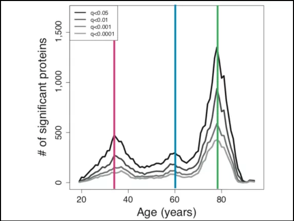 78岁  研究人员分析了4263名18-95岁人群的血浆样本,通过对血液中蛋白质含量变化的研究,发现有1379种蛋白会随着年龄的增加变化而发生变化。 而这其中,衰老相关蛋白的数目并不是随年龄的增加平稳地改变,而是呈波动变化,并在34岁、60岁和78岁年龄段出现极峰。
