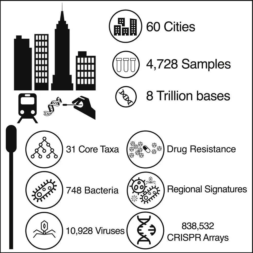 这项研究为全球首次60个城市大规模检测,国际MetaSUB联盟的研究人员和志愿者从2015年到2017年的3年时间里,在包括上海、香港、台北等城市的地铁售票窗口、座位、扶手、车站地面等表面(少数没有地铁的城市,则以火车或公车代替),收集了近5000份样本。