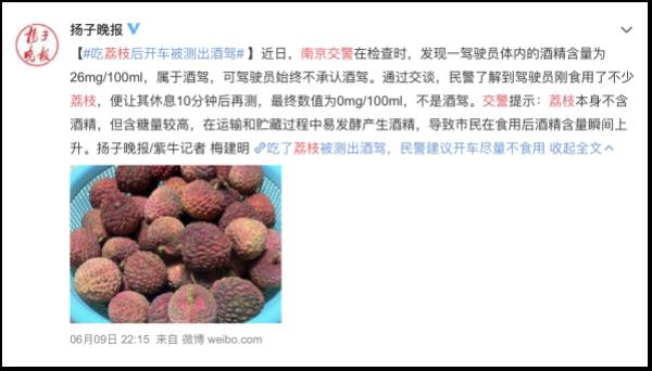 因为吃荔枝被查酒驾的情况,生活中也时有发生:  中南大学湘雅三医院营养科王萌在2020年接受健康时报采访时谈到,荔枝是一个高糖水果,在运输保存中间会进行无氧酵解,产生乙醇,含糖量高的水果都会出现这种情况,还有大家熟悉的蛋黄派同样如此。