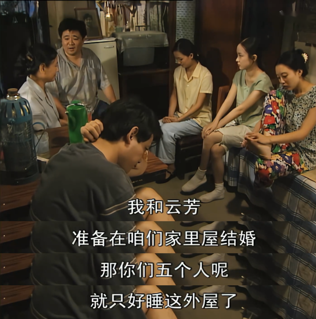 外屋弟弟妹妹四张单人床上下垒起来加固,变成两张上下铺,中间拉个帘子当男女宿舍。 箱子上加席梦思垫子,成了大民妈的床。 张大民扭着胖身子在屋里量了半天,电视机只能学小龙女吊在半空中。 这不算什么, 很快,三弟大军娶了媳妇毛莎莎,也进了里屋。 两床前后放着,隔着板子帘子,成了双婚房。 挤得五弟大国做噩梦,看到的都是椅子腿。 考上大学后,他在酒席上喝点酒,突然抱着他妈嚎啕大哭,说,妈,我太挤了,以后上内蒙新疆种青稞、种向日葵,上山上住一辈子,再也不回来了。