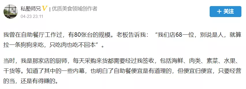 当时,我是那家店的厨师,每天采购来货都需要经过我签收,包括海鲜、肉类、素菜、水果、干货等。知道了其中的一些内幕,也明白了自助餐便宜是有道理的,但便宜归便宜,只要经营得当,还是有得赚的。