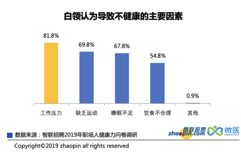 根据智联招聘《2019年职场人健康力报告》数据显示: