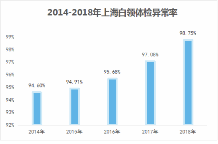2013年-2018上海白领体检异常率,从94.6%上升到了到了惊人的98.75%。