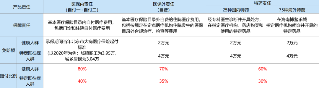 医保以外的自费部分:健康人群,免赔额2万,有特定既往症的,免赔额4万。