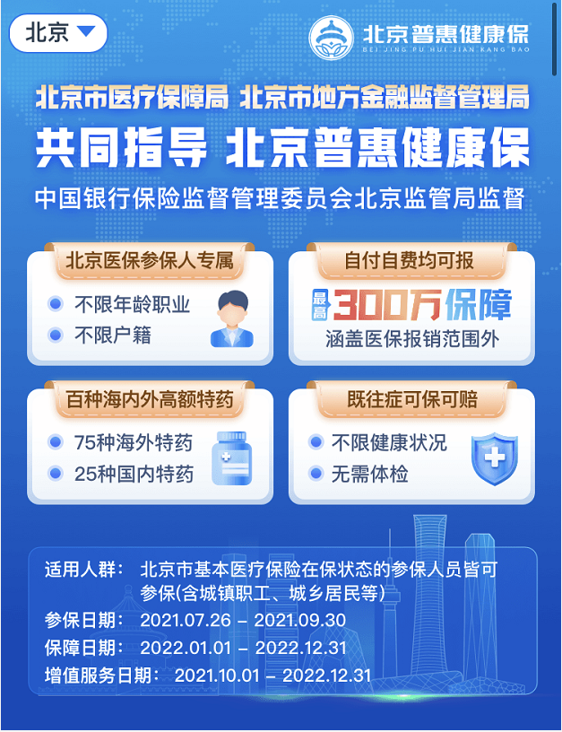 北京普惠健康保是专为北京医保参保人定制,紧密衔接基本医疗保险的一款普惠的商业健康保险产品,由中国人民保险、中国人寿、泰康保险、中国太平洋保险、中国平安五家保险公司设计开发,医渡云提供主运营平台,并由北京市医疗保障局、北京市地方金融监督管理局共同指导,由中国银行保险监督管理委员会北京监管局负责监督。