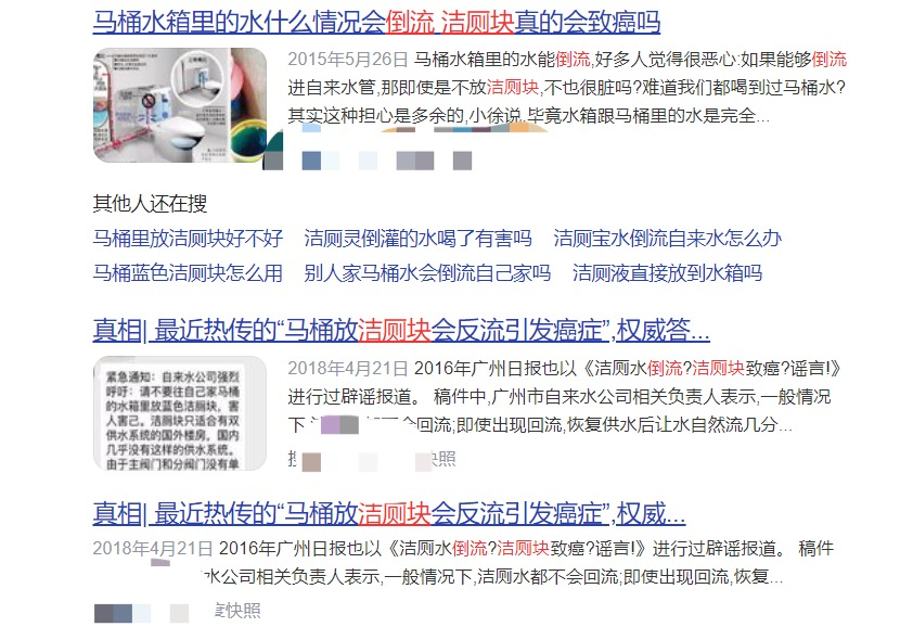 细细推敲上边的文字,似乎很有道理,推理充分,小编上网也搜索到很多信息:如下图:  网络截图 这一说法让一些经常使用“蓝色洁厕块”的家庭人心惶惶。洁厕块的蓝水会不会倒流进供水管道,进而污染自来水呢?会产生致癌物质吗?小编这就带你去看看!