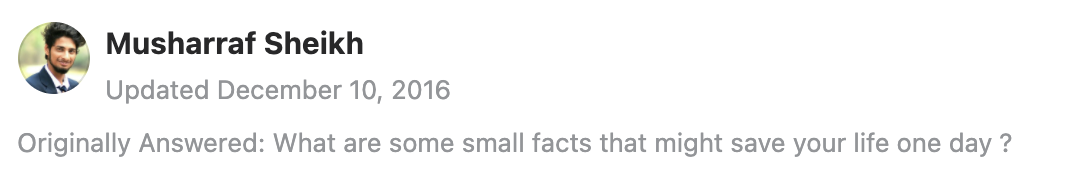 1.如果你身处着火的建筑物,千万不要,我是说千万不要试图打开窗户。如果你这样做,会让大量空气及氧气进入房间,可能会发生某种爆炸。尽量呆在低处,以获得最大的氧气用于呼吸,如果可能的话,你也可以尝试到建筑物的底部,但永远不要尝试到顶层。 2.如果有尖锐物体刺进你的身体,千万不要试图自己把它拉出来,因为这可能使伤势更加严重。 3.如果你在丛林中迷路了,请记住,没有空气你可以活3分钟,没有水可以活3天,没有食物可以活3周。 4.如果有一天,有人闯进你的车,用枪指着你,让你开车送他/她去一个地方,你应该做的是,乖乖听话开车,然后突然把车撞到某个地方。这将引起每个路过的人的注意,这样的话,这个人就会害怕被人抓住而不会伤害你。