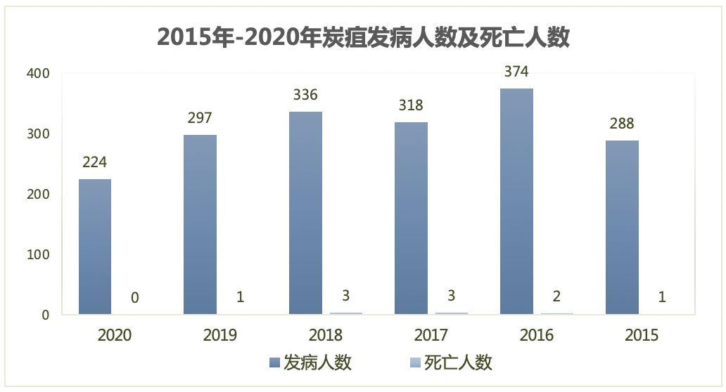2020年,炭疽发病人数为224例,死亡人数为0例; 2019年,发病人数297例,死亡人数1例; 2018年,发病人数336例,死亡人数3例; 2017年发病人数318例,死亡人数3例; 2016年发病人数374例,死亡人数2例; 2015年发病人数288例,死亡人数1例。