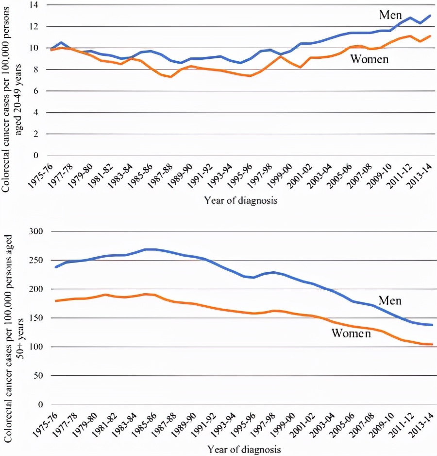 不同年龄和性别的结直肠癌发病比例趋势(美国癌症研究所SEER数据库) // 结直肠癌患者为何“偏爱”年轻人