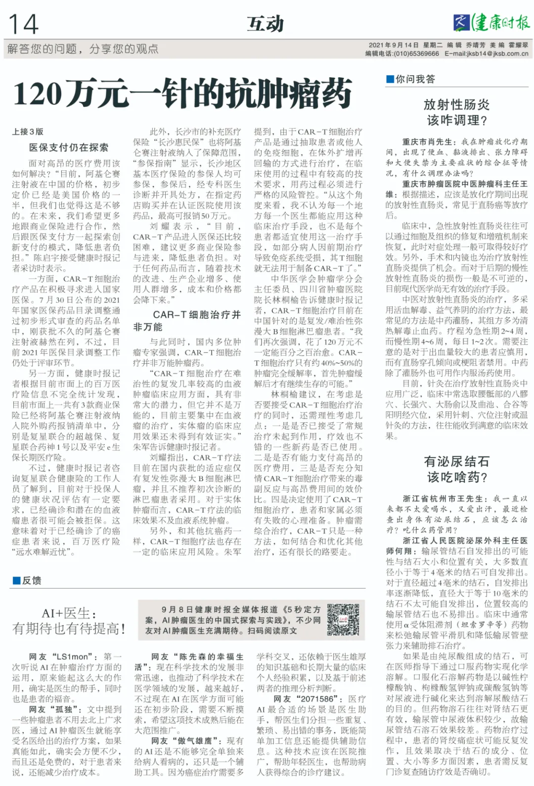 当健康时报记者进一步问及会否考虑使用CAR-T细胞疗法时,李凡沉默了一会儿,回答,“上百万的定价,像我一样的大多数患者想都不敢想,不是不想拿,不舍得拿,是拿不出来。”