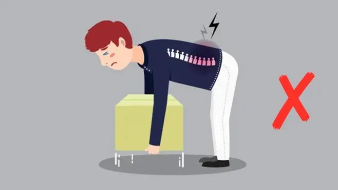 这两个动作会大大增加腰背筋膜、肌肉、韧带等处的负担,容易造成损伤。而且,提重物时人往往会“猛地发力”,以便将物品抬离地面,这种突然用力过大或姿势转换过猛,有可能造成腰椎损伤。