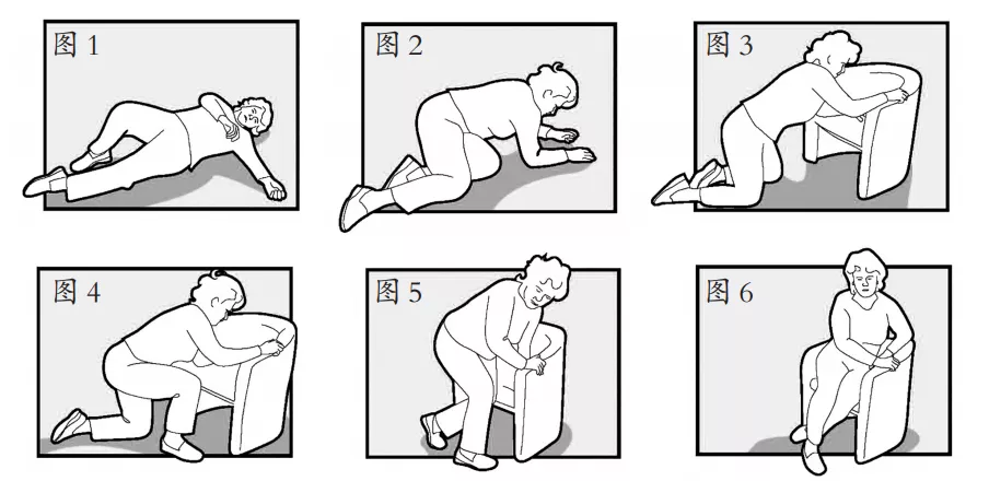 - 若没有受伤,可以慢慢地翻身,翻转为爬行姿势,用手、膝盖撑地,爬向附近稳固的椅子,借助其支撑慢慢起身,倚靠一会再正常活动(如下图所示)。整个过程要非常缓慢。