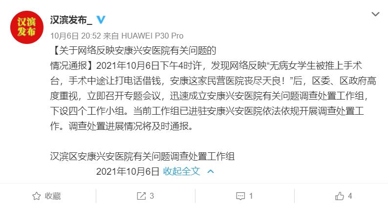 对此,中共汉滨区委宣传部在官方平台发布“情况通报”,通报称:2021年10月6日下午4时许,发现网络反映“无病女学生被推上手术台,手术中途让打电话借钱,安康这家民营医院丧尽天良!”后,区委、区政府高度重视,立即召开专题会议,迅速成立安康兴安医院有关问题调查处置工作组,下设四个工作小组。