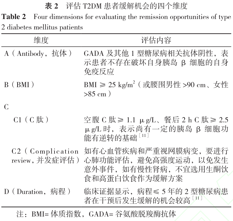 《共识》建议采用“ABCD”评估方法确定T2DM缓解基本条件,见表2。(证据级别:4,推荐级别:D)