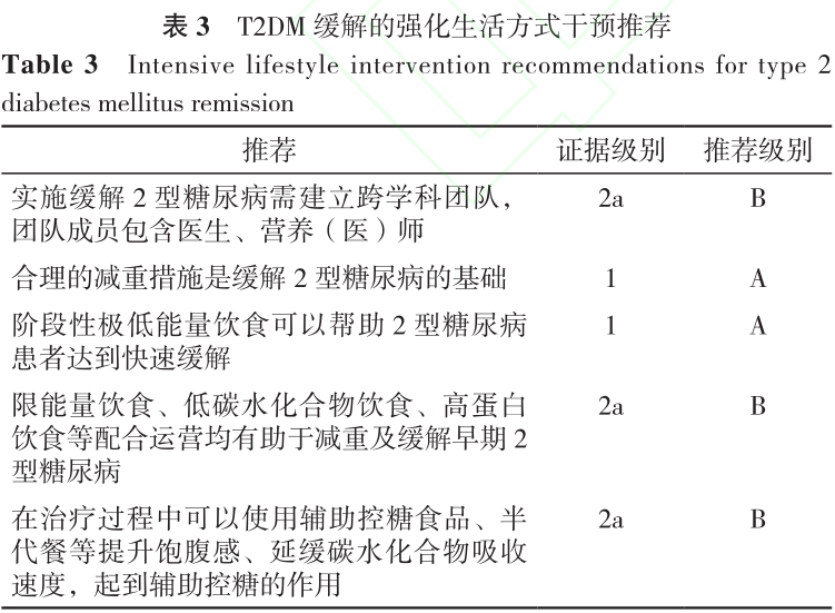 《共识》强调缓解T2DM需建立跨学科综合干预团队,形成配套管理流程,需遵循5R原则(责任、评估、现实、缓解、随访),具体方案如下。推荐强化生活方式干预(饮食营养、运动等)作为所有T2DM缓解的基本方案。基本推荐方案见表3。  1.饮食营养治疗