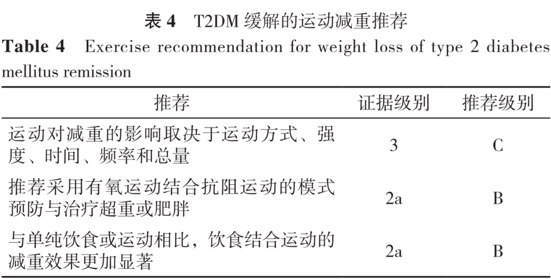 运动是控制体质量的最佳手段之一。运动是T2DM治疗的基础,糖尿病患者通过运动可以直接消耗部分能量而达到控制血糖的目的。运动也可以增加肌肉的容积并使胰岛素敏感性得到持续性改善。此外,运动还可以改善患者血脂、血压和心血管健康,提高其愉悦感。开具运动处方T2DM缓解的运动减重推荐见表4。  开具运动处方应该按照“评估健康、制定目标、选择项目、设定强度、运动训练、评估效果、适时调整”的流程来进行。