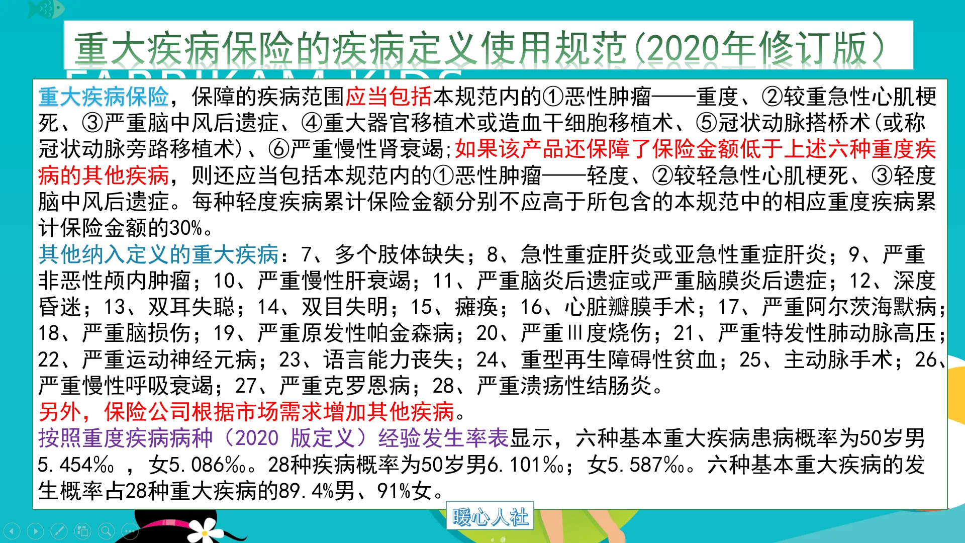 然后说一下重疾险。重疾险,指的是重大疾病保险。按照国家2020年修订的《重大疾病保险疾病定义使用规范》,重大疾病保险主要应当包括:重度恶性肿瘤、较重急性心肌梗死、严重脑中风后遗症、重大器官移植术或造血干细胞移植术、冠状动脉搭桥术、严重慢性肾衰竭,另外还应当包括三种轻症。另外,还有其他纳入定义的21种重大疾病。