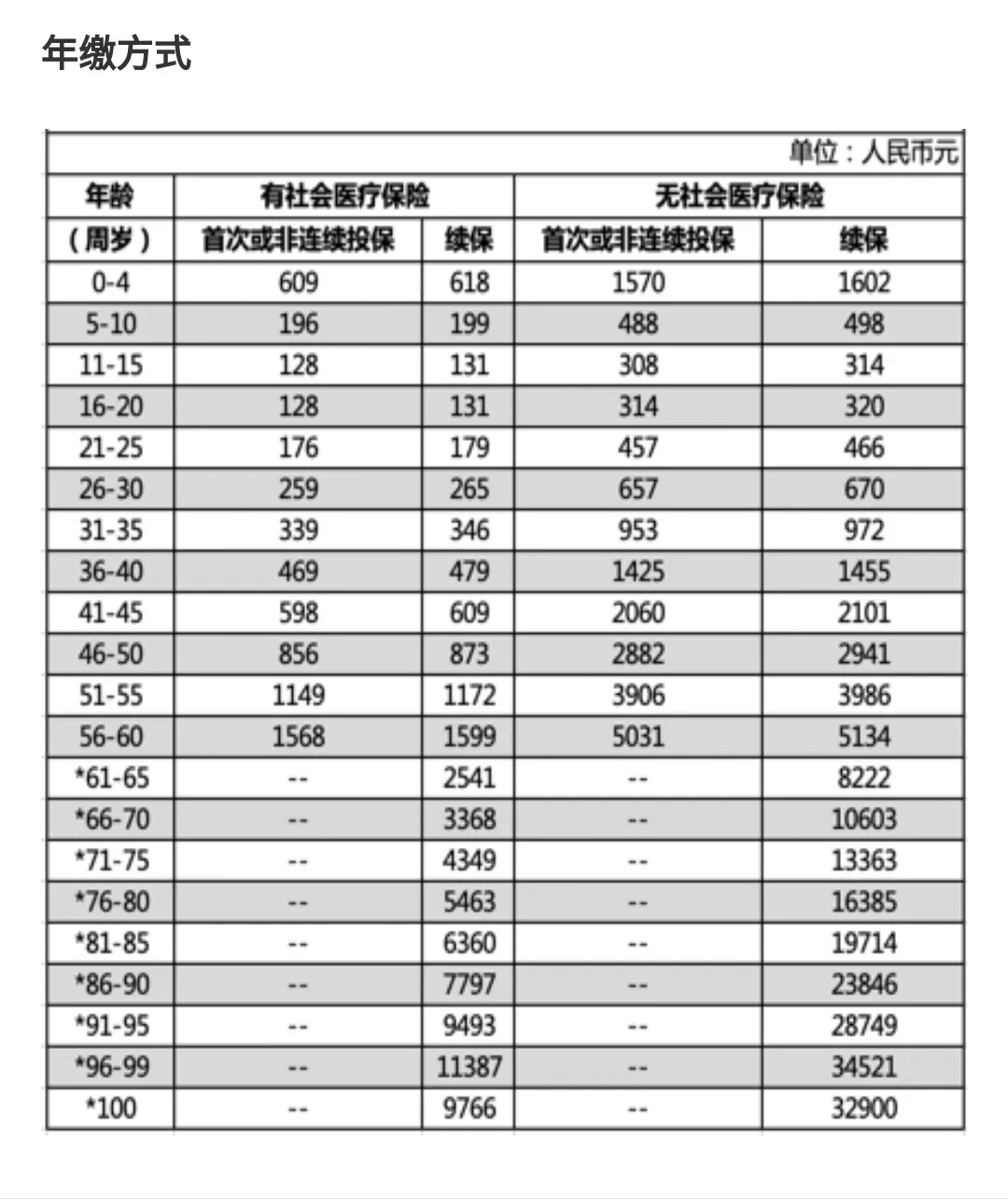 怎么说呢?百万医疗险报销起来的概率很低。比如说下面这种百万医疗险,主要是根据年龄得病的风险确定的缴费钱数。得病概率越大的时候,我们缴费的钱数就会越多。即使在有社保的情况下,96~99岁也需要缴纳11,387元。没有社保的情况下,需要缴纳34,521元。大家都明白,90多岁的年纪,得病的概率很高很高。