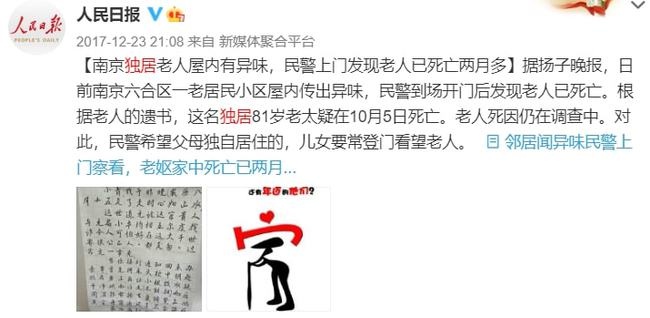 “我于昨晚去世,走时心如止水”,这是2017年12月南京一小区内81岁独居老人留在遗书上的话,遗体被发现时,老人已去世两个多月。