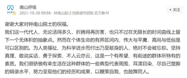 今天,钟南山院士团队“南山呼吸”发文称,“谢谢大家对钟南山院士的祝福。为人类福祉、为科学进步而付出乃至献身的人,绝对不会被忘却。”