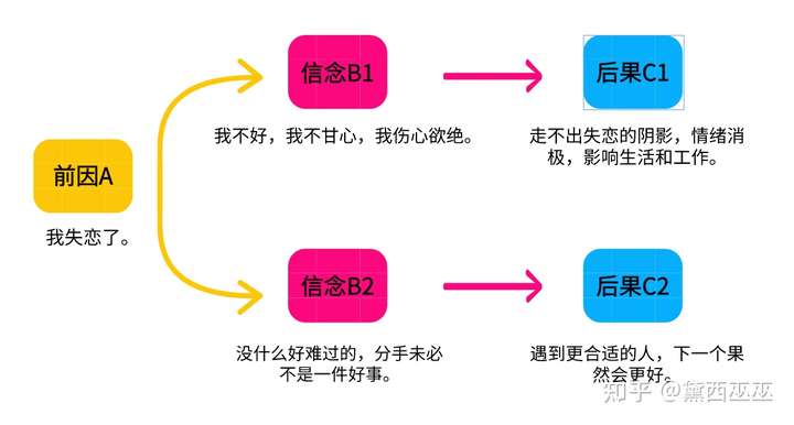 A(Antecedent)指事情的前因, C(Consequence)指事情的后果, B(Belief)指因自我和外界的评价而产生的信念。 有前因必有后果,但是前因A,可以产生好的结果C1,不好的结果C2,因为前因到后果之间,一定会通过一座桥梁B,B才是影响后果的根本因素。 举一个栗子: