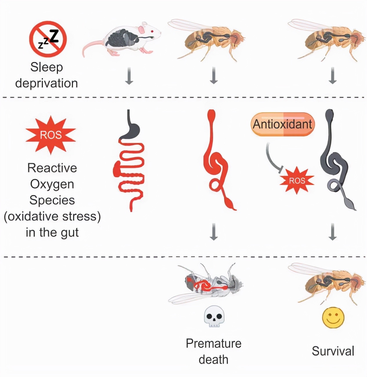 研究人员发现,在长期睡眠不足的情况下,肠道中会不断累积活性氧(ROS),并且显著减短实验果蝇的寿命。也就是说,熬夜的确会造成果蝇过早死亡。