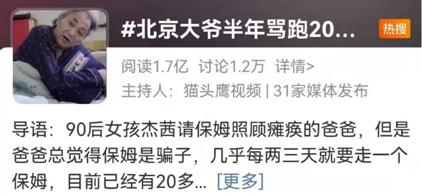 这两天,有位北京大爷上了热搜,他和老伴双双瘫痪在床,而女儿请来的保姆,他半年骂跑了20个。
