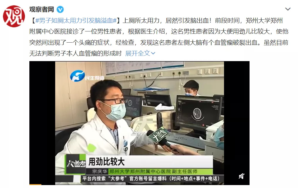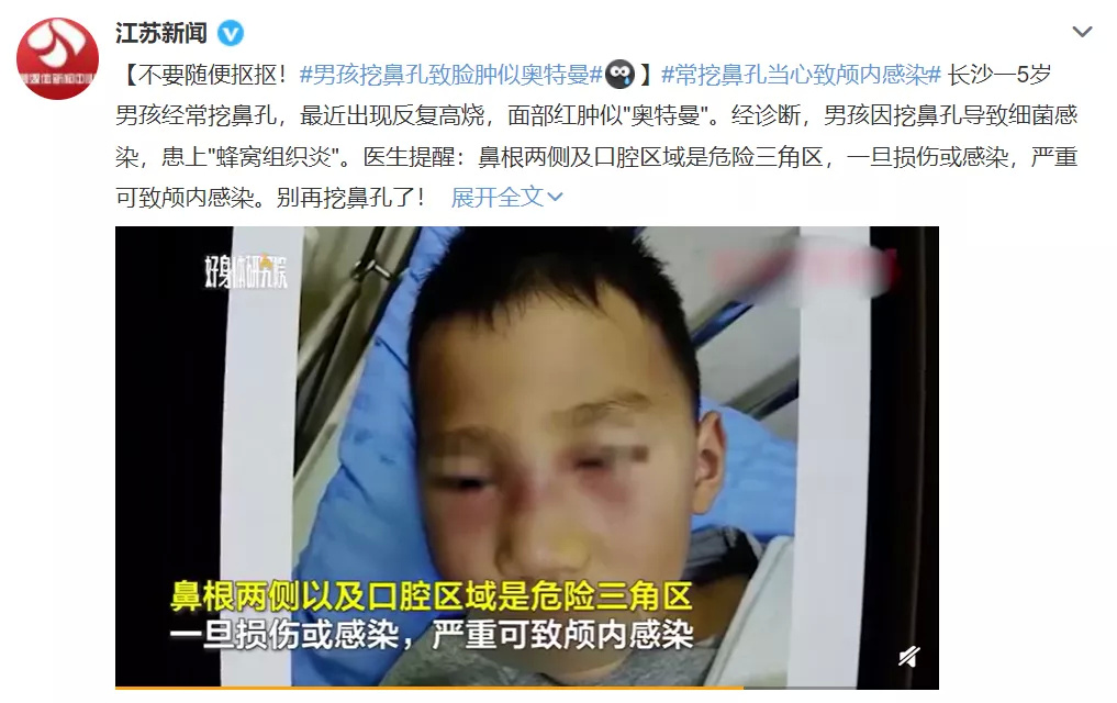 几乎每一天,我们都会看到各种奇葩的新闻事件。有一些新闻看完就一笑而过了,但有一些,却让人感到无比震惊:  图片来源:新浪新闻微博 男子因为咳嗽和肺部不适住院,按照普通肺炎治疗后不见好转,医生百思不得其解,最后发现,竟是肺部真菌感染。而背后的原因更出人意料,竟然是因为他每天都闻自己脱下来的臭袜子! 其实,这样的新闻还有很多,这些看起来很小概率的事,背后却藏着不容忽视的安全隐患。 我们找到了 10 个大家生活中可能会忽视的小事,给大家一一讲解,快坐好小板凳,做好小笔记了。  图片来源:网络 01 挖鼻孔只是一时爽,危险! 很多人都喜欢闲着没事抠一下鼻孔,然而这却是一个很危险的操作,可能会导致颅内感染。 长沙的一名 5 岁男孩就因为爱挖鼻孔患上了「蜂窝组织炎」,脸肿得神似「奥特曼」。  图片来源:江苏新闻微博 我们的手指上有很多细菌病毒,挖鼻屎相当于亲手把它们送进了鼻腔。虽然免疫系统可以干掉细菌,但如果免疫力差或者不小心抠破了,细菌就可能趁虚而入。 鼻子和周围区域构成的「危险三角区」,让细菌能够抄近道钻进脑袋里,可能造成海绵窦感染和颅内感染。一旦细菌突破防线进入全身,引发多器官衰竭,后果更不堪设想。  虽然概率并不高,但概率低不等于不会发生。所以还是管住自己的手,抠鼻孔、拔鼻毛、挤三角区痘痘和这些危险操作,就忍一忍吧。 02 荸荠别生吃,小心寄生虫! 荸荠,也就是我们俗称的马蹄,剥了皮直接吃清脆爽口,是很多人的最爱。但生吃荸荠,可能会有寄生虫感染的风险。 杭州的王女士就因为生吃荸荠后腹痛入院,结果在体内取出了 2 条活的姜片虫。  图片来源:人民网微博 荸荠是一种水生植物,很容易被水中一些寄生虫的幼虫,比如姜片虫寄生。 当用牙啃荸荠皮或者生吃荸荠时,幼虫可能会进入体内、寄生在小肠并发育为成虫,导致姜片虫病,出现腹痛、腹泻、恶心、呕吐、发热和水肿等症状,严重时可能引发肠梗阻,甚至死亡。 因此,荸荠最好不要生吃。同样,菱角、茭白、莲藕等水生植物也建议做熟了再吃。 03 尿尿急不得,否则会晕倒! 很多人早晨起来被尿憋醒后会痛快地大尿一顿,感觉这样特别舒爽,但随之而来的,可能是一场昏厥。 武汉的刘先生就因为尿得太急,昏倒在地,被同事送进了医院。  图片来源:广州日报微博 尿个尿也能晕倒?没错,这种现象被称为「排尿性晕厥」。 过猛过快的排尿,会让迷走神经过度兴奋,从而抑制心脏活动、使心率下降;同时膀胱快速排空、腹压突然下降、流回心脏的血液减少。 这一来二去,心脏供给大脑的血液不足,再加上刚睡醒或者太疲惫时脑袋本就昏昏沉沉,晕厥就发生了。 不过排尿性晕厥不是大问题, 1~2 分钟内可自行苏醒,也不会有什么后遗症(一旦情况严重,还是要及时送往医院治疗),但更大的隐患在于晕倒时容易发生磕碰,如果撞到重要部位可能会有生命危险。 所以,尿尿这件事,还是不要太急了。最重要的是,能不憋尿就别憋。 04 大便 3 分钟就好,别太用力了 除了痛快地尿,很多人也喜欢痛快地拉,但是「屎学」讲究量力而行,用力太猛,后果可能很严重。 大便太用力,还真会引起脑溢血。  图片来源:观察者网微博 虽然新闻里这名男子本身就有动脉瘤这个导火索,即使没有排便用力这件事,也可能有其他因素导致破裂出血。 但我们要知道的是,排便这件事,太用力了可能会得不偿失:血压升高、肌肉强烈收缩,不仅容易得上痔疮,还会增加心脏的负担;太久了也会增加脱肛、痔疮的风险,尽量在 3 分钟内解决比较好。 05 小颗粒食物,一定要慢慢吃 冬天到了,花生瓜子成了很多人家庭桌上的饭后小零食。但这小玩意儿,一不小心可是会惹大事的。 新闻里就讲了这样一个特殊的病例:67 岁的老人连续 9 年反复咳嗽,一直治不好,症状日益严重,住院检查才发现是支气管被一粒花生米堵住了。  图片来源:人民网微博 有些时候,被小颗粒食物呛到后,不会出现急性的「气道异物」症状,容易被我们忽视。但这样的危害是慢性且累积的。 因此在吃东西,特别是小颗粒食物时,一定要小心慢吃。当感到有异物掉进了气道,或发生了剧烈呛咳,不能掉以轻心,应及时就诊。 对于小朋友而言,小颗粒食物也可能会堵住气道,导致急性症状,比如憋气、呼吸困难、窒息等,这时可以采用世界通用的气道异物急救方法——海姆立克急救法。 06 误吞枣核别大意,两头尖尖是凶器 除了呛到气管里的异物,吞到食道里的异物也一样有风险,可能会导致食道或肠道的损伤或穿孔。  图片来源:江苏新闻微博 很多中老年人习惯煮粥时把红枣煮得软烂,就着汤喝下肚,很多时候,根本不记得自己吞下了枣核,或者觉得能够自己排出去,结果却腹痛难忍进了医院。 别看枣核小,但它两头尖尖,对食道和肠道可算得上是十分危险的凶器。 因此提醒大家一定要时刻小心,特别是给老人和小孩吃的,在煮粥熬汤之前记得先把枣核剔掉。 07 剩菜剩饭热透了吃,远离致病菌 吃生食或没热透的饭菜,可能会造成致病菌感染,严重时会威胁生命。 广州的陈女士很可能因为吃了没热透的剩饭菜,感染了李斯特菌,导致了脑膜炎,险些丧命。  图片来源:央视网微博 导致脑膜炎感染的罪魁祸首,是剩饭剩菜中的一种有致病性的李斯特菌。这种菌可以在冷藏温度下的食物中繁殖、在冷冻温度下生存,被称为「冰箱杀手」。 李斯