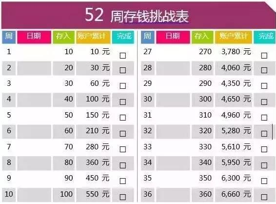 52周刚好是一年,第一周存钱10元,第二周存钱20……以此类推,每周递增10元,52周可以存款13780元; 比如“365天存钱法”: